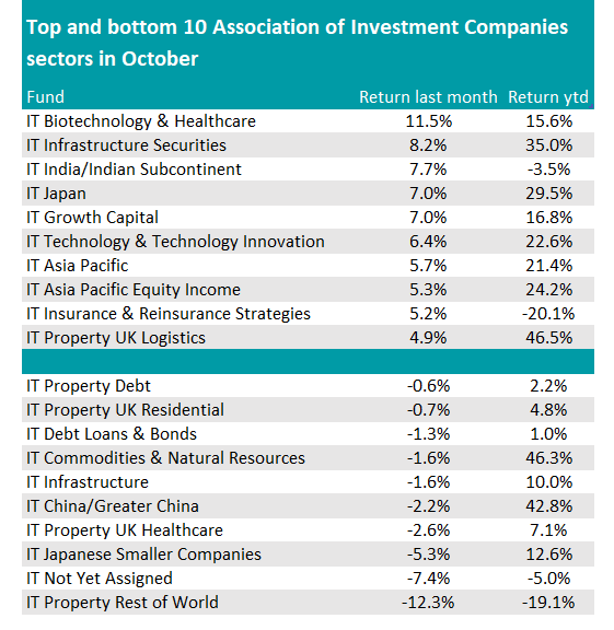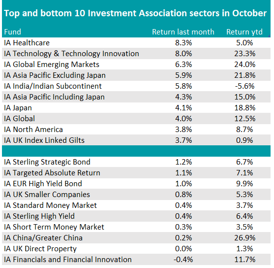 The same trend was evidenced in the IA Healthcare sector too, which had a reverse of fortunes and, after years in the doldrums, topped the sector performance table in October with a 8.3% return.