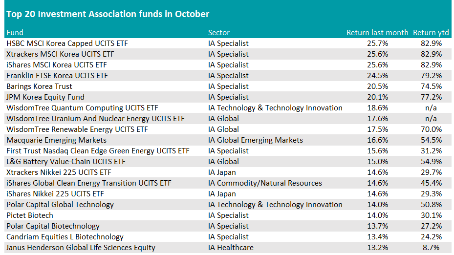 The winner of the month was the WisdomTree Quantum Computing UCITS ETF, which was launched at the end of August and last month added 18.6%. However, Polar Capital Global Technology has won the year so far, grabbing the top spot in the table with a stellar 50.8% return in 2025. It also had an impressive 31 days in October, with a 14% growth. Herald Worldwide Technology had the third place over the month (12.7%).