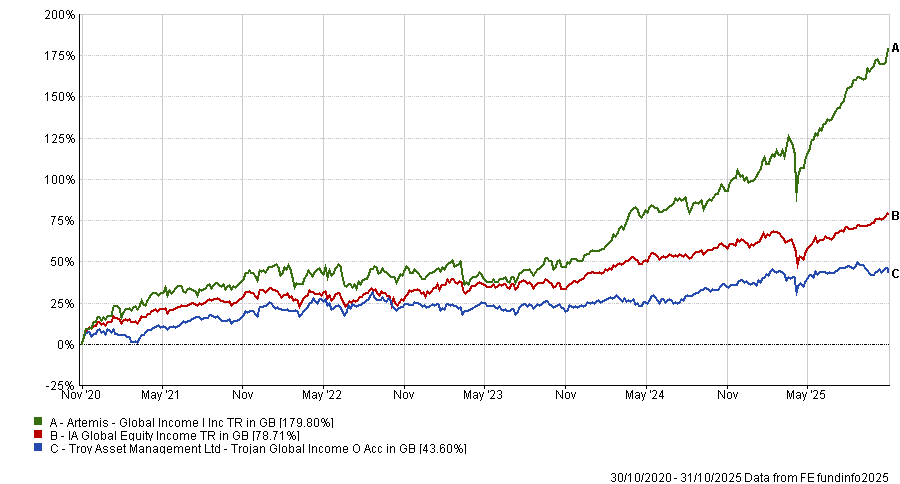 This leads them to focus on “quality and resilience first”, preferring businesses with low earnings volatility, such as consumer goods companies. While this has led to it trailing Artemis Global Income over most standard timeframes, Trojan Global Income is much less volatile as a result, with just 9.1% volatility over the past five years.