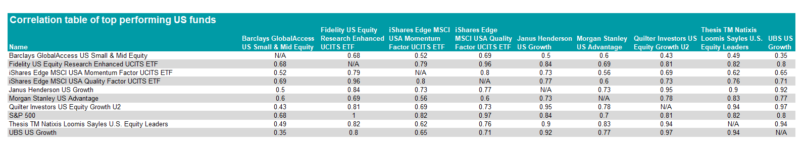 The other fund acting as a differentiator from other top performers is iShares Edge MSCI USA Momentum Factor UCITS ETF, which has a correlation score of below 0.7 to five funds on the list.