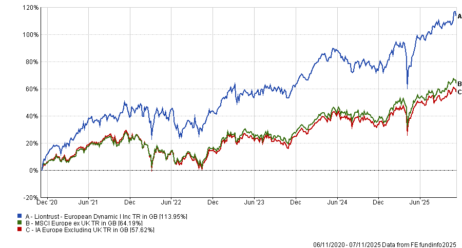 Rounding out the top three is the £2.2bn Liontrust European Dynamic – also with an information ratio score of 0.8, alongside a total five-year return of 132.9% and volatility of 15.3%.