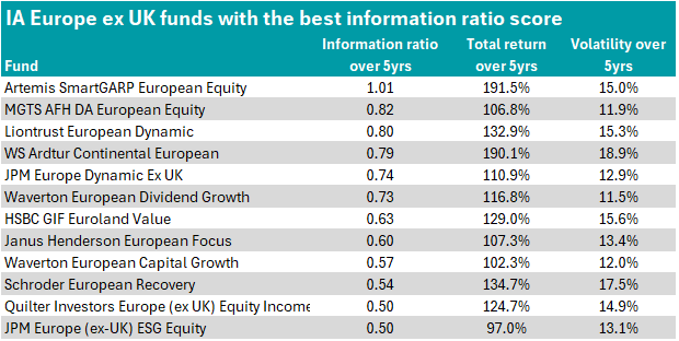 Top of the table is the £1.3bn Artemis SmartGARP European Equity, with an information ratio score of 1.