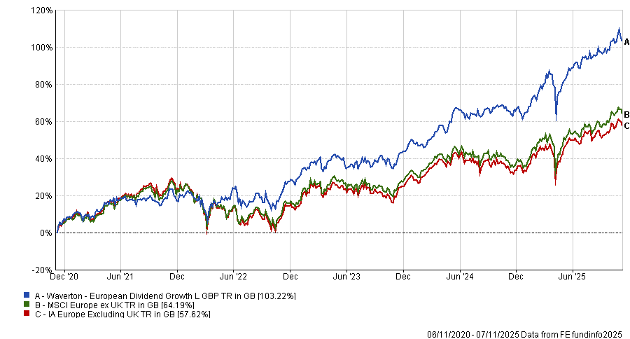 With a five-year return of 116.8%, it beat the Waverton European Capital Growth across the three assessed parameters. The Waverton dividend fund has also delivered top-quartile returns over three and 10 years.