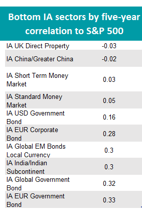 The only equity sector with a negative correlation to the S&P 500 was IA China/Greater China, with the average fund growing when the US fell and vice versa, to the beat of a -0.02 correlation.