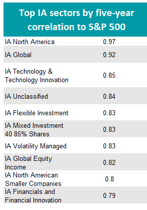 Of course, the IA North America sector has the highest correlation with the S&P 500, at 0.97, as would be expected. Not only do its members tend to focus on the US over Canada, but around a fifth of funds are index trackers.