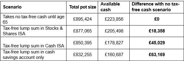 As shown in the table below, a 55-year-old with a £500,000 pension pot who chooses to withdraw their full 25% tax-free sum and move it into a cash savings account paying 4% could lose out on £63,169 in tax-free cash by age 65.