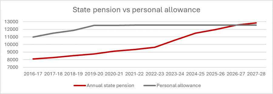 Under these terms, the state pension is set to rise by 4.8% (earnings growth) from next April, meaning the new state pension will sit just £22 below the frozen personal allowance (£12,570).