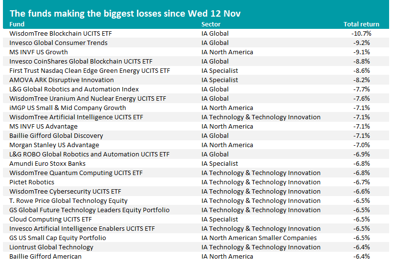 FE Analytics shows that the average fund in every sector in the Investment Association universe has made a loss since Wednesday 12 November, with the biggest drops being seen in the IA North American Smaller Companies, IA Financials and Financial Innovation, IA Technology & Technology Innovation and IA North America peer groups.
