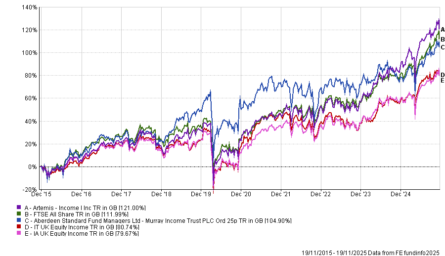 Formerly managed by Aberdeen’s Charles Luke, the trust has been a bottom-quartile performer in the IT UK Equity Income sector over the past three and five years, although its 10-year track record is some 24 percentage points above the sector average. It has failed to beat the FTSE All Share index over this time, however.