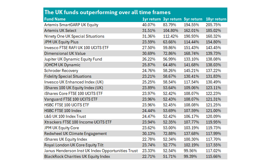 Twenty four UK funds have delivered top-quartile returns over the past one, three, five and 10 years, Trustnet research has found.