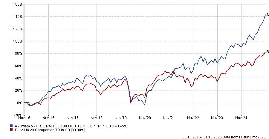 The top passive fund over 10 years is the Invesco FTSE RAFI (Research Affiliates Fundamental Index) UK 100 UCITS ETF, which is up 143.5%.