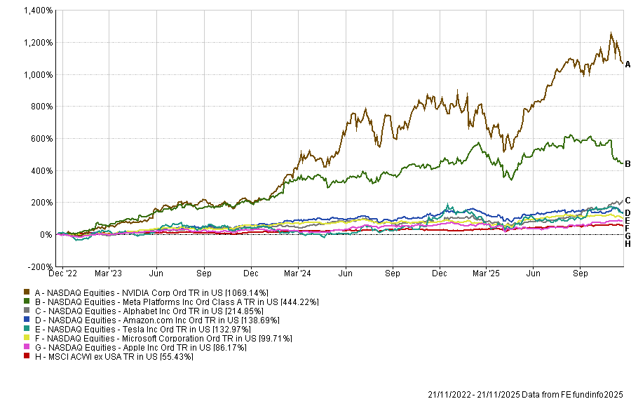 Performance of the Magnificent Seven vs MSCI ACWI ex USA over 3yrs