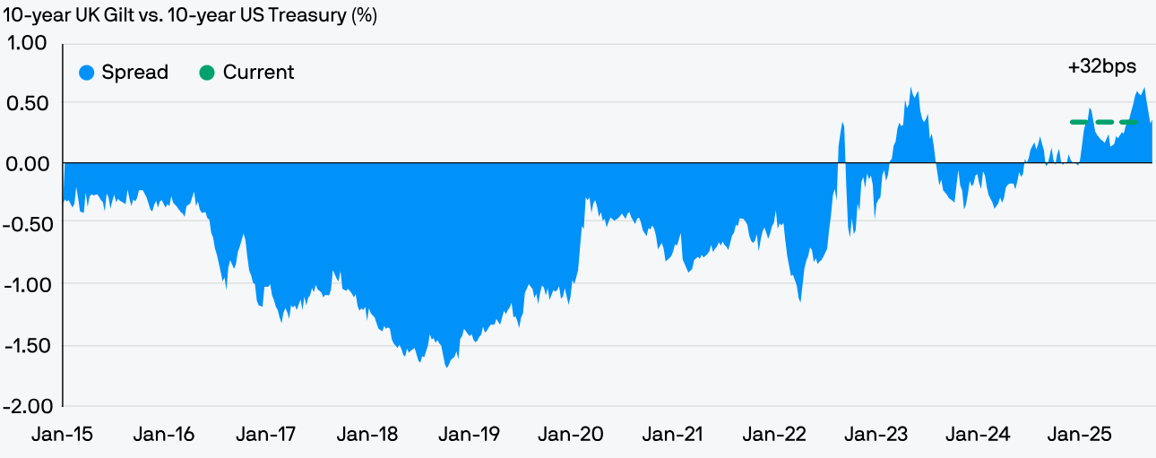 JPMorgan demonstrated this by comparing the 10-year gilt and 10-year US treasury spread, which was still elevated at 32 basis points as of 11 November 2025, defying the negative spread which has been the norm over the past decade.