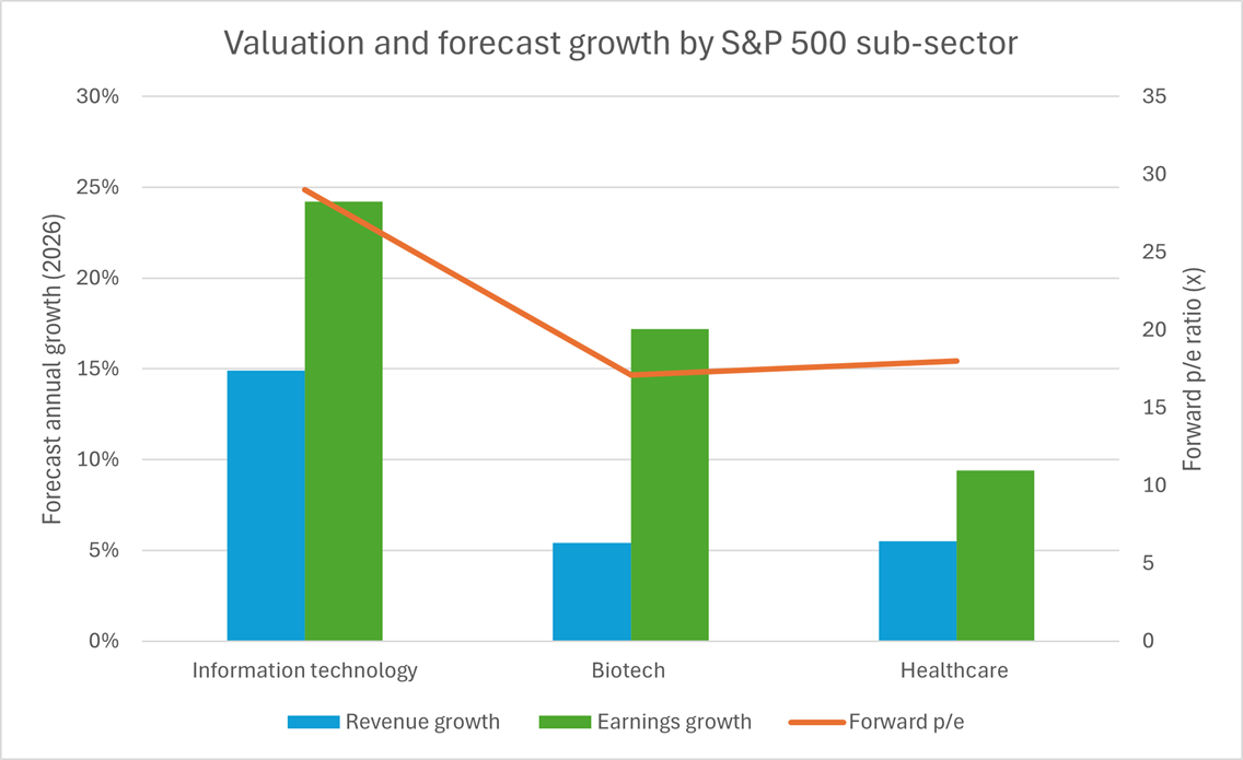 Valuations also remain appealing for growth-minded investors, with many small- and mid-caps still trading below their cash levels. As the chart below shows, the S&P 500 biotech sector currently trades at a near 40% discount to the technology sector on a forward price-earnings (P/E) ratio, while boasting a healthy 17% forecast increase in earnings.