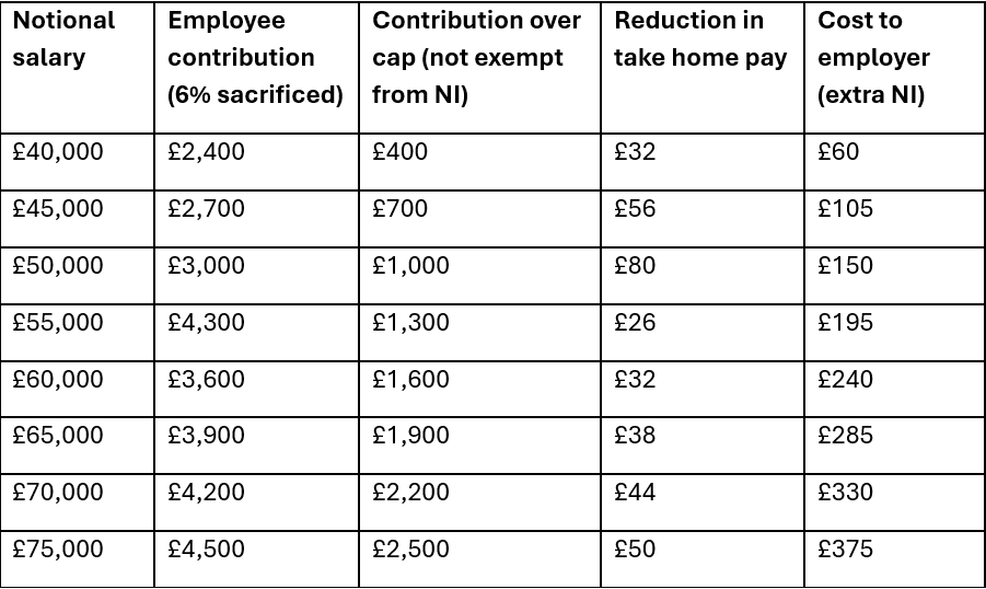 The below research by AJ Bell shows the impact on employee pay packets and the extra NI bill to employers per year of the £2,000 a year cap – assuming the employee has agreed to exchange 6% of their notional salary for a pension contribution, with a 6% employer match.