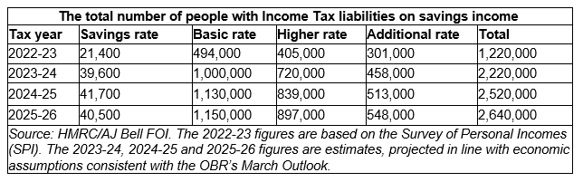 AJ Bell analysis shows that 2.64 million people already are expected to be hit with tax on their savings this year. The new tax rates are expected to cost an additional £100 for someone with £5,000 of savings interest above their personal savings allowance.