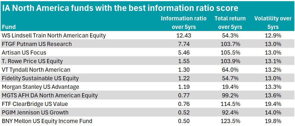 Top of the table with an information ratio score of 12.4 – the highest score by some distance – is WS Lindsell Train North American Equity.
