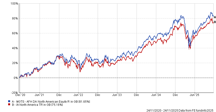 One of the biggest funds in the table is the £868.7m MGTS AFH DA North American Equity, which logged an information ratio score of 0.8, five-year return of 99.2% and volatility of 13.6%.