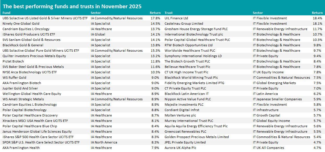 Funds investing in precious metals and healthcare stocks were the biggest winners in November, FE fundinfo data shows, while those focused on artificial intelligence (AI) and cryptocurrencies tanked.