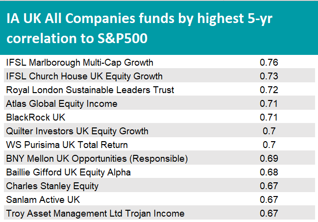 Trustnet looked at the five-year correlation between IA UK All Companies funds and the S&P 500, and while the average number across the sector was 0.59, there were seven outlier funds, which displayed high levels of correlation of 0.7 or above.