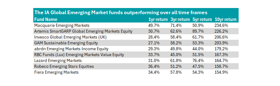 However, several funds have proven their ability to navigate these choppy markets over recent years and outperform their peers. As part of an ongoing Trustnet series, we examined the IA Global Emerging Market strategies, which delivered top-quartile returns over one, three, five and 10 years (the standard time frames used by most investors).