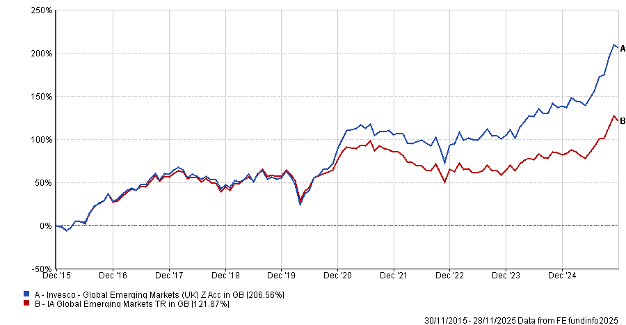 Another consistent option is the £1bn Invesco Global Emerging Markets (UK) Fund, which has also delivered top-quartile results over one, three, five and 10 years.
