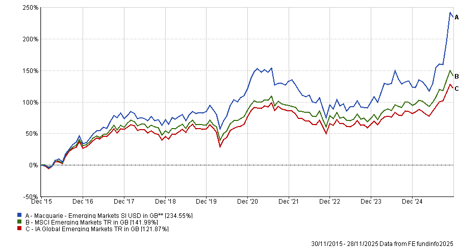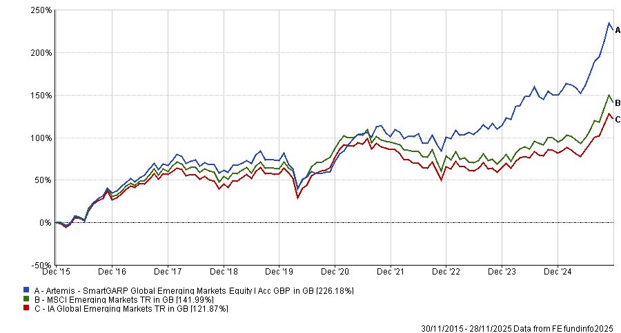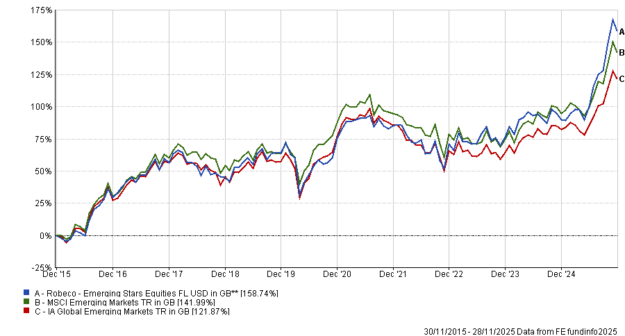 The largest strategy to make the shortlist in this research is the £2.5bn Robeco Emerging Stars Equities fund, up 158.9% over 10 years.