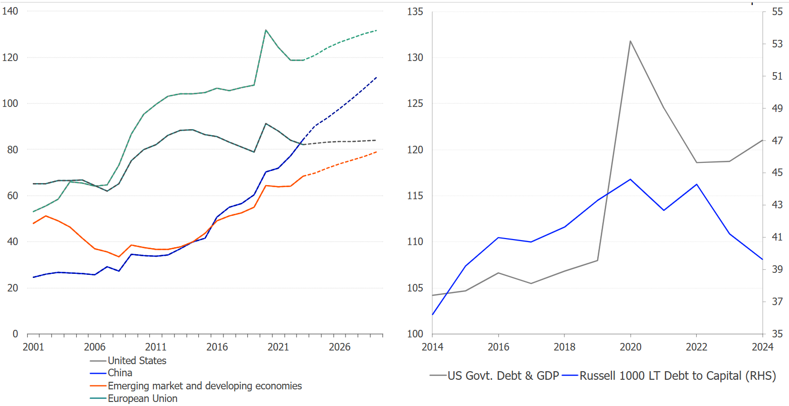 As shown in the left graph below, there is a surge in government bond yields underscoring rising fiscal burdens. The other graph - using the US and Russell 1000 as the example - shows how government debt is rising faster than corporate leverage, which looks more stable.