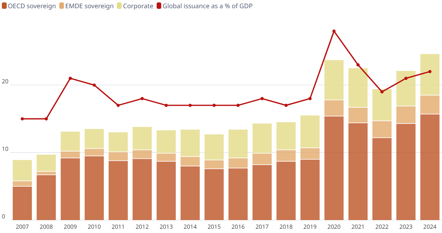 According to the OECD’s Global Debt Report 2025, global borrowing surged to $25trn in 2024, over $10trn above pre-Covid levels and nearly triple 2007 figures. Meanwhile, sovereign debt issuance in OECD countries was $16trn last year and is predicted to hit $17trn by the end of 2025, with refinancing needs reaching $13trn – around 80% of gross borrowing.