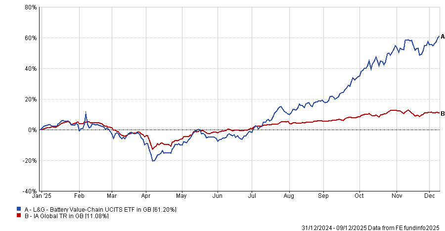 Performance of L&G Battery Value-Chain vs sector over 2025