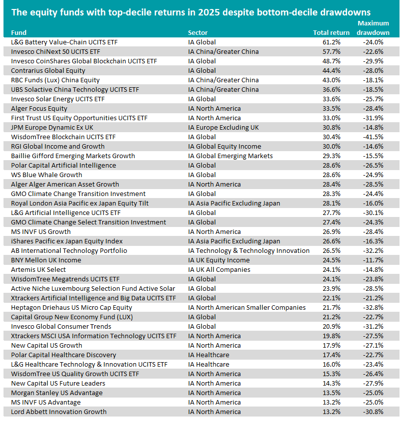 In this research, Trustnet reviewed fund performance across the Investment Association's 23 equity sectors. We identified funds in the top decile for total returns but bottom decile for maximum drawdown in 2025. Of the 2,393 funds in these sectors, 40 fit the criteria.
