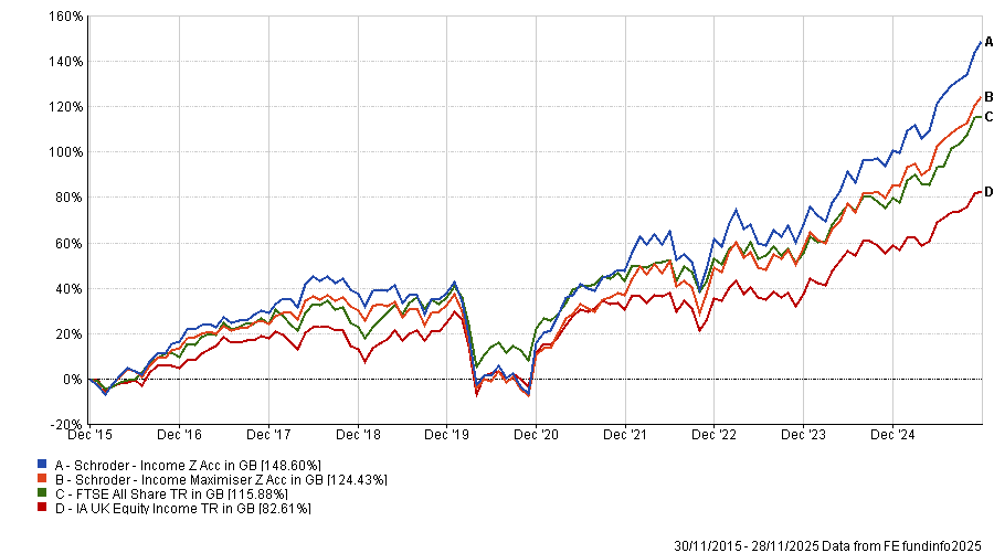 Its stablemate Schroder Income Maximiser, which follows a similar approach but uses derivatives to enhance the income, also appeared in the table. However, long-term Schroder managers Nick Kirrage and his co-manager Kevin Murphy, who are responsible for the fund’s track record, departed the team earlier this year and in 2024.