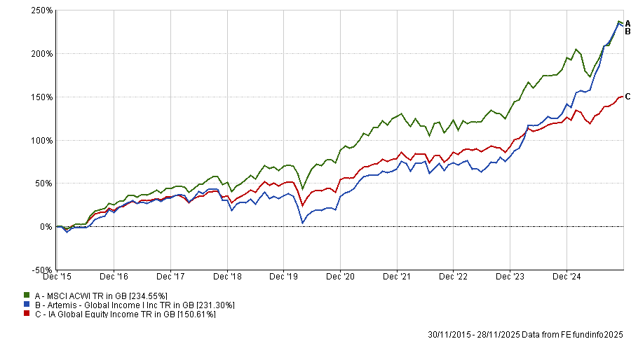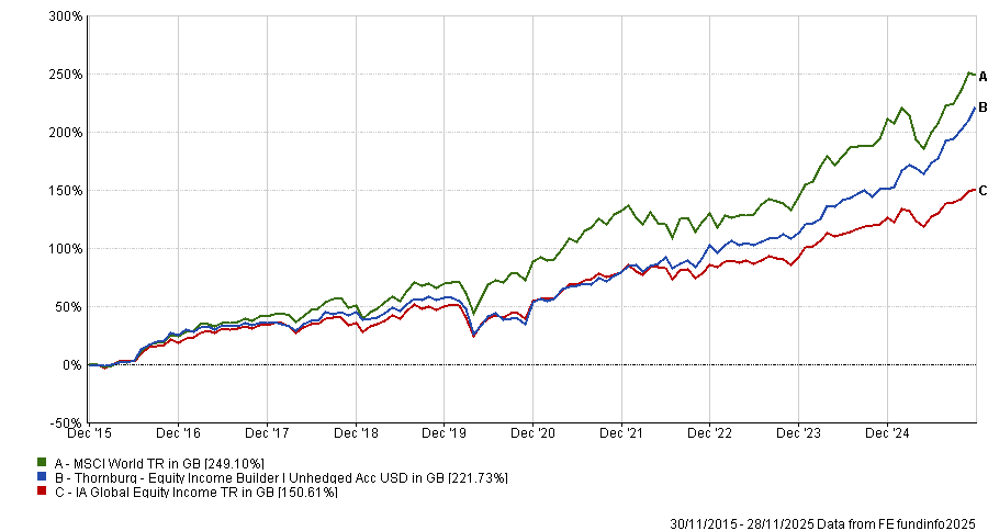 Shifting to the IA Global Equity Income sector, the Jupiter Merian Global Equity Income (IRL) fund topped the peer group over 10 years with a 238.2% total return. Across one, three, five and 10 years, it has consistently been in the top five of the sector in terms of performance.