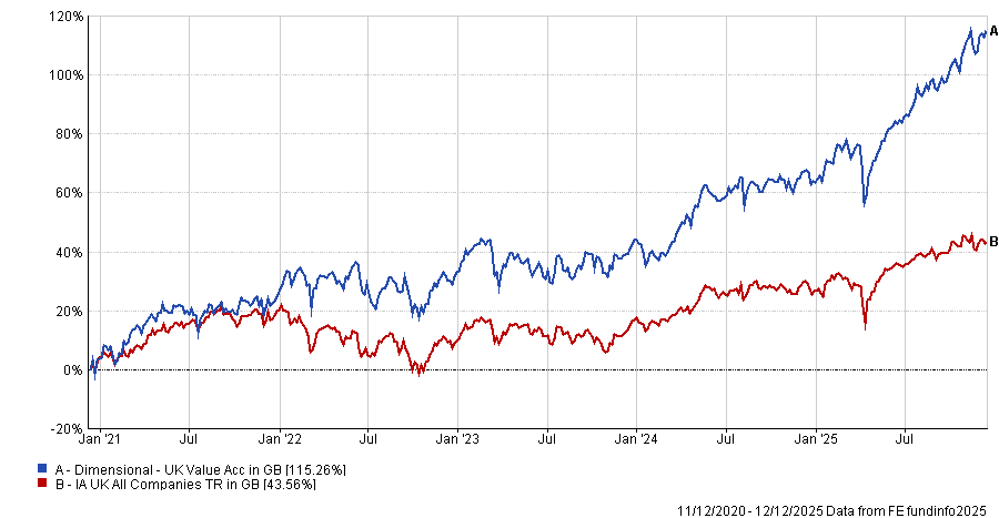 Meanwhile, Dimensional UK Value takes a systematic route, using academic research and broad diversification to capture the long-term value premium. It has achieved an information ratio of 0.8 and a five-year return of 118.6%, albeit with slightly higher volatility at 12.6%.
