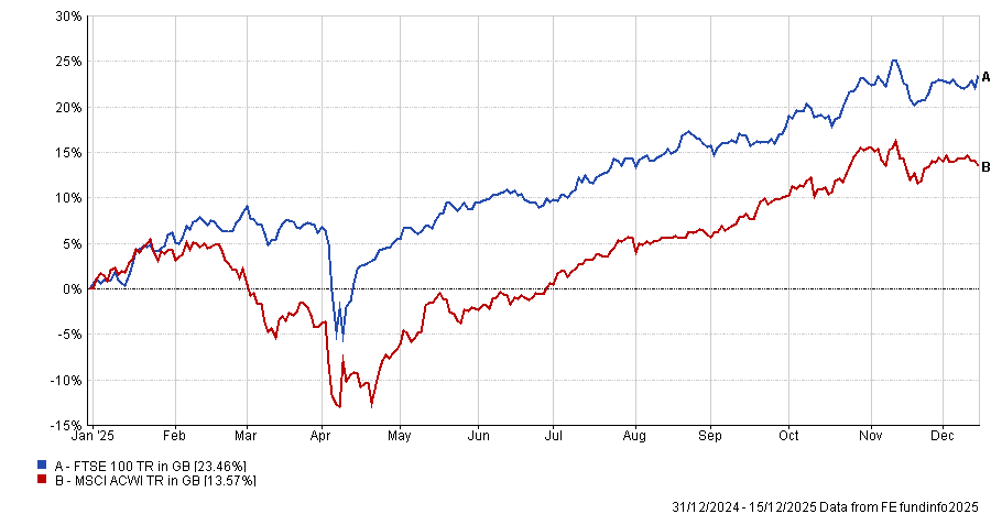 Performance of FTSE 100 vs MSCI AC World in 2025