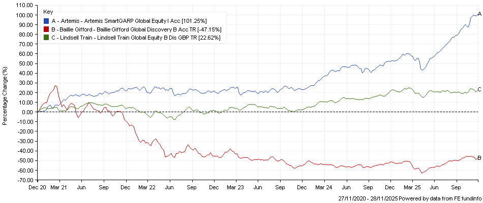 Artemis’s Raheel Altaf was highlighted on Trustnet this year as one of the Alpha Managers with the highest returns over 2025; Baillie Gifford’s John MacDougall and his team have lost money last year and over the past three and five years but have achieved better results in 2025 with second-quartile performance so far; while Nick Train’s and James Bullock’s flagship fund has been struggling with significant headwinds in the past few years, as the chart below shows.
