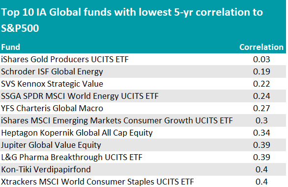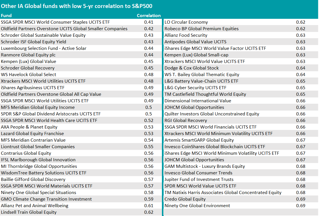 In the 581-strong IA Global sector, 76 funds (approximately 13%) had low correlation to the S&P 500 (below 0.7), meaning they were least following the performance pattern of companies on the other side of the Atlantic.