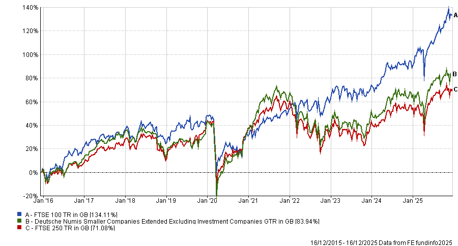 The FTSE 100 has been the place to be in the UK market, outperforming the Deutsche Numis smaller companies and the FTSE 250 by almost 50 percentage points over the past decade.