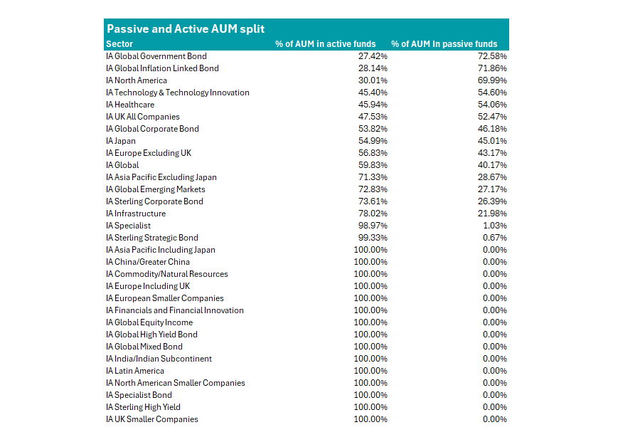 The dominance of passives within the IA UK All Companies sector (52.5% of AUM) follows a similar trend, according to Khalaf.