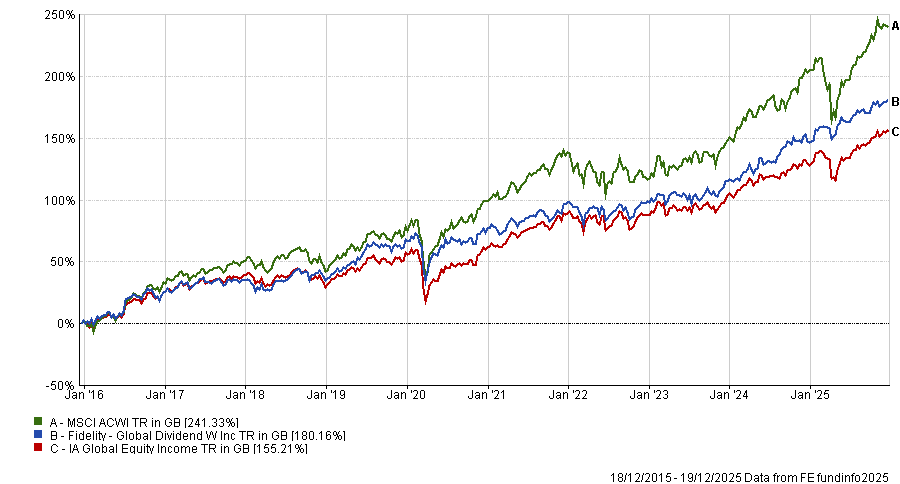Given its income focus, Fidelity Global Dividend has just 23.9% allocated to the US, compared with 64.7% for the MSCI ACWI benchmark.