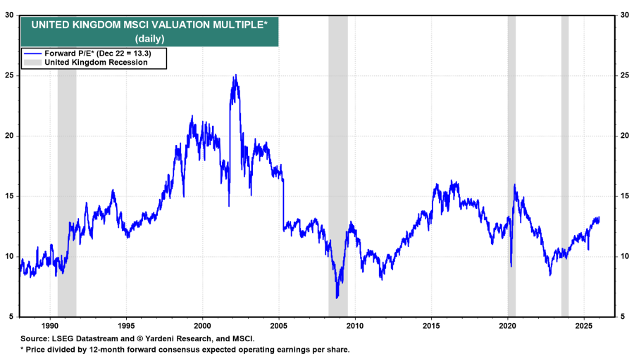 Yardeni Research data shows that the MSCI United Kingdom index sits on a forward P/E of 13.3x. While this is not as high as it has been in the past, it has come up significantly from its nadir, as the below chart shows.