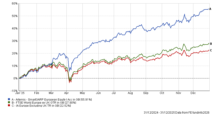 Moving beyond the top 25, Philip Wolstencroft’s Artemis SmartGARP European Equity fund was up 55.9% in 2025, topping the IA Europe ex UK sector. It was the 33rd best performing fund in the IA universe overall.