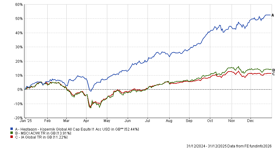 In the IA Global sector, the best-performing active fund was the Heptagon Kopernik Global All Cap Equity fund (up 52.5%).