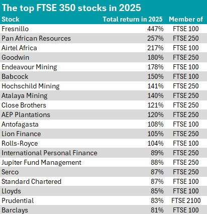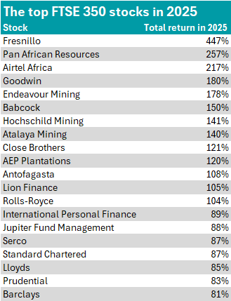 When looking at the best performers of the year, the top 20 best-performing FTSE 350 stocks in 2025 proved to be an even split between FTSE 100 and FTSE 250 companies at 10 stocks apiece.