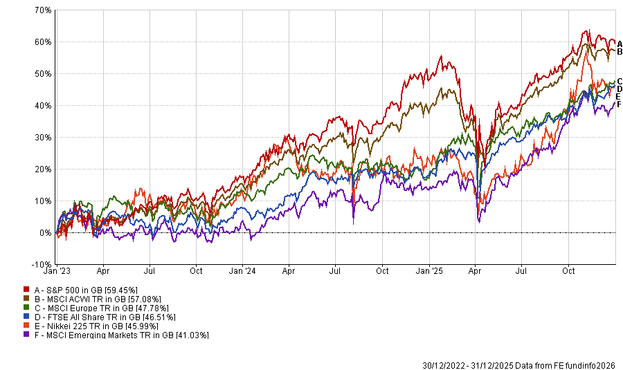 But that does not mean that 2025 was a re-run of the previous two years. While equity markets ended the year in the black, US equities were at the bottom of the pile, with the S&P 500 up just 8.4%. Meanwhile, the MSCI Europe rocketed up 26.1% and the FTSE All Share rose by 24%, according to data from FE Analytics.