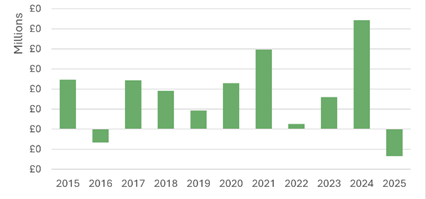 This was broadly in line with 2024’s £9.6bn and marked the tenth consecutive year of net outflows, despite UK share prices reaching all-time highs during 2025.