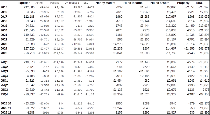 Money market funds recorded a particularly strong year, absorbing £5.8bn of net inflows – a record annual figure. Fixed-income funds also saw renewed interest, with inflows rising by half to £1.5bn, although this remained less than half the decade average, reflecting ongoing volatility in bond markets.