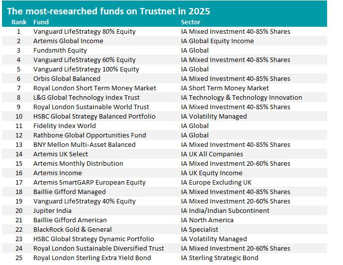 Of course, some funds will have been losing research share as others get more popular. Jupiter India, Royal London Global Equity Select, Baillie Gifford Managed, Vanguard LifeStrategy 60% Equity and Fundsmith Equity are among those being researched less in 2025 than they were in the previous year.