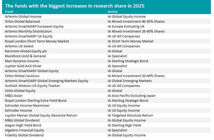 Artemis SmartGARP European Equity, Artemis Monthly Distribution, Artemis SmartGARP UK Equity, Artemis UK Select, Artemis SmartGARP Global Equity and Artemis SmartGARP Global Emerging Markets Equity all had some of the largest increases in research share; most of the funds are in their sector’s top decile for 2025 (aside from the emerging markets fund, which made second-decile returns).