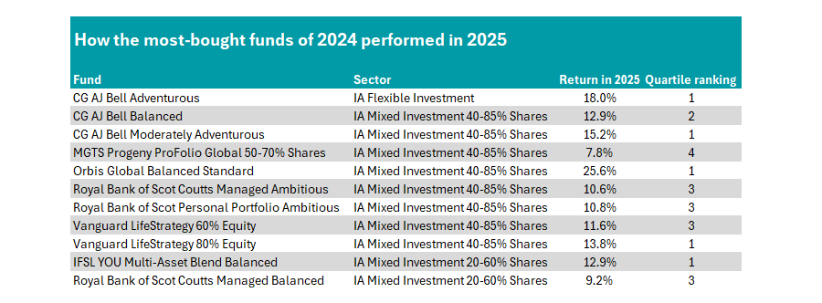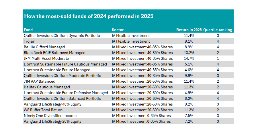 Conversely, the list of most-sold funds in 2024 struggled to gain traction in 2025. Indeed, only one fund made a top-quartile return last year: JPM Multi-Asset Moderate.